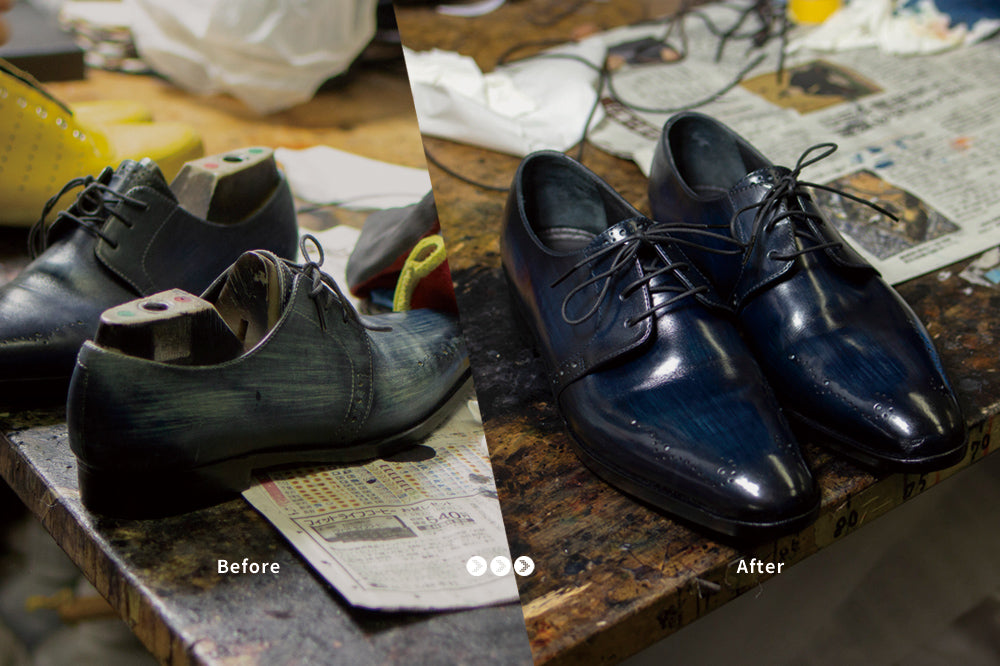 以下は、ご依頼いただいた修理内容とともに当社にて行うサービスです。長年の使用によって変化・劣化した靴が息を吹き返したかのようなツヤを取り戻した状態でお返しいたします。