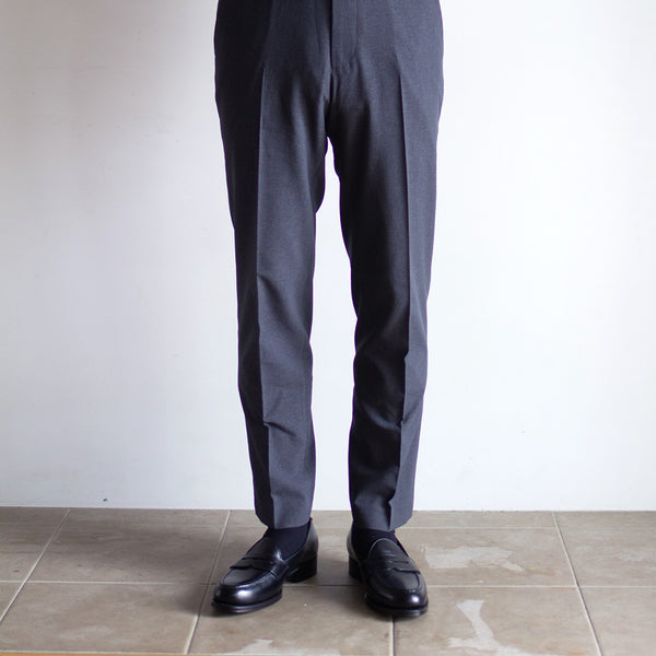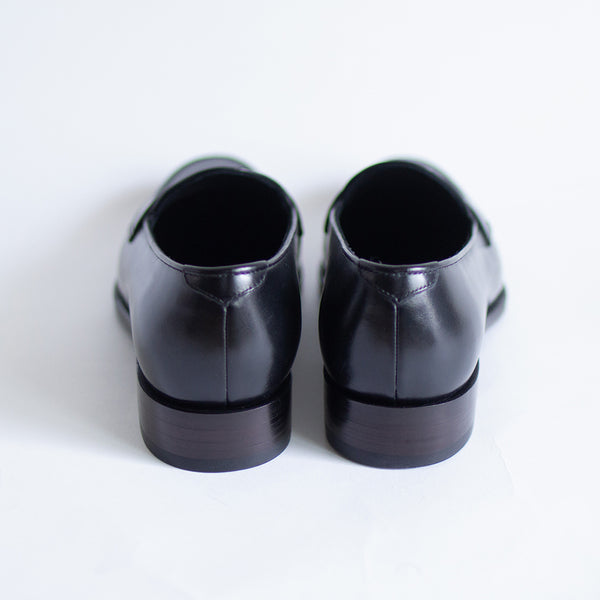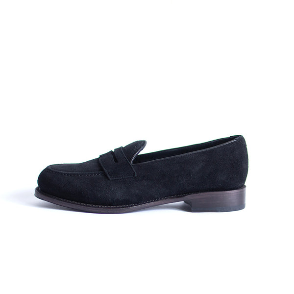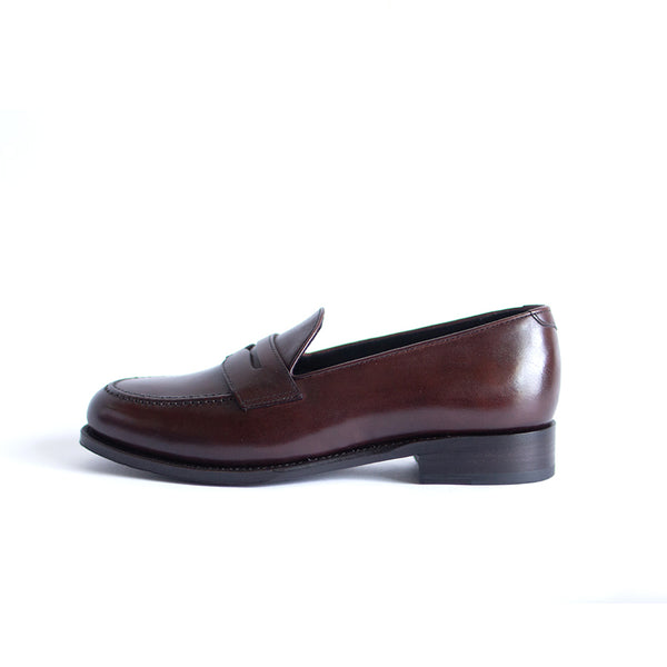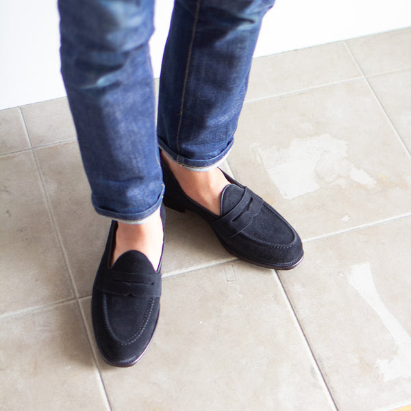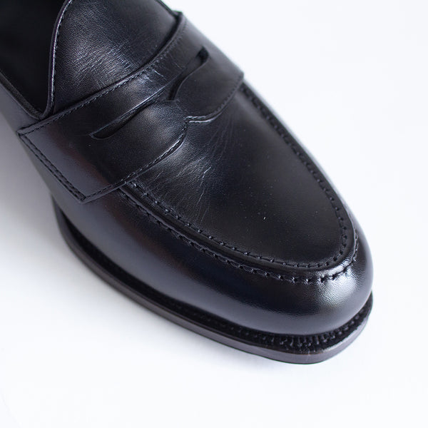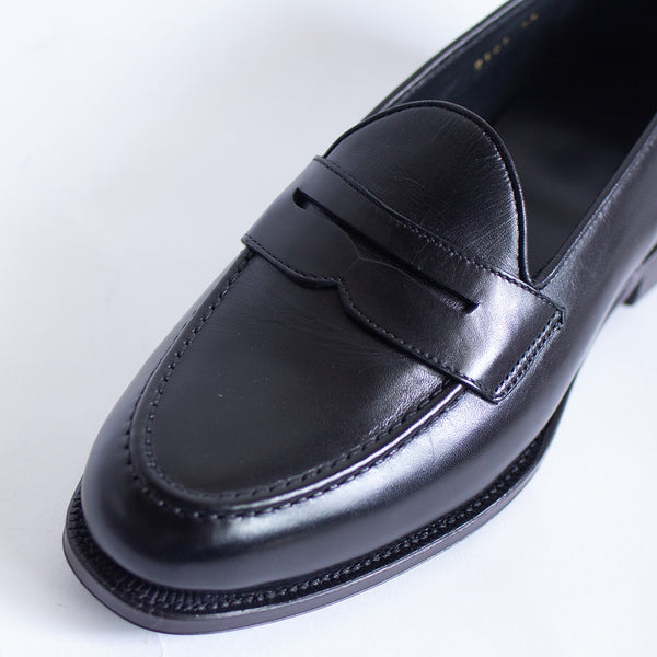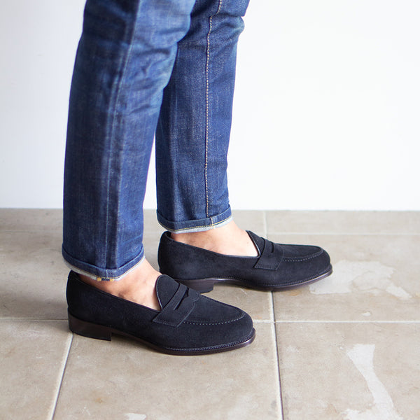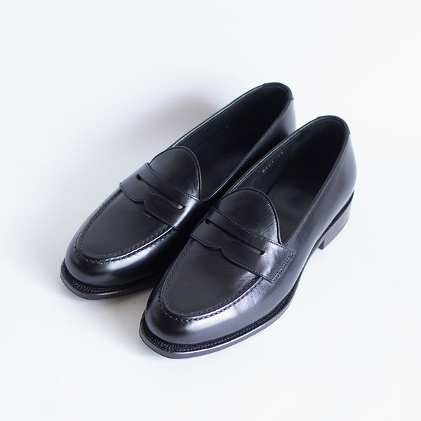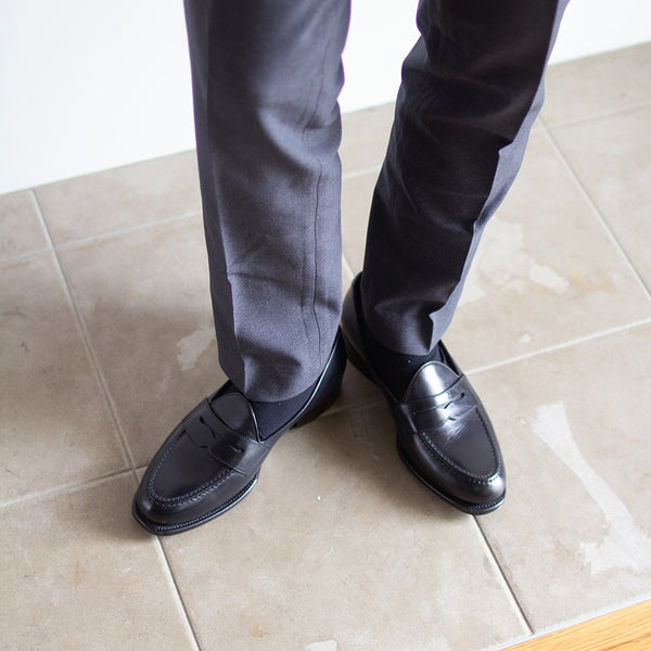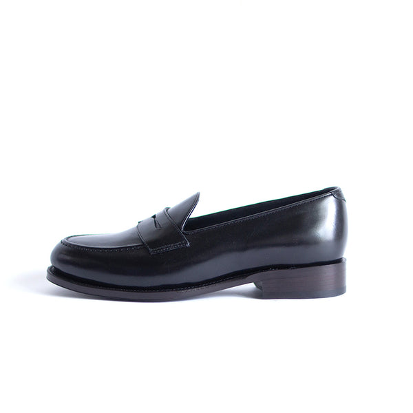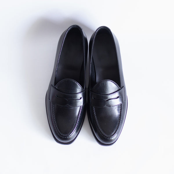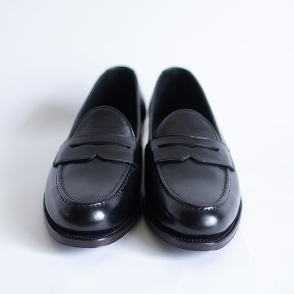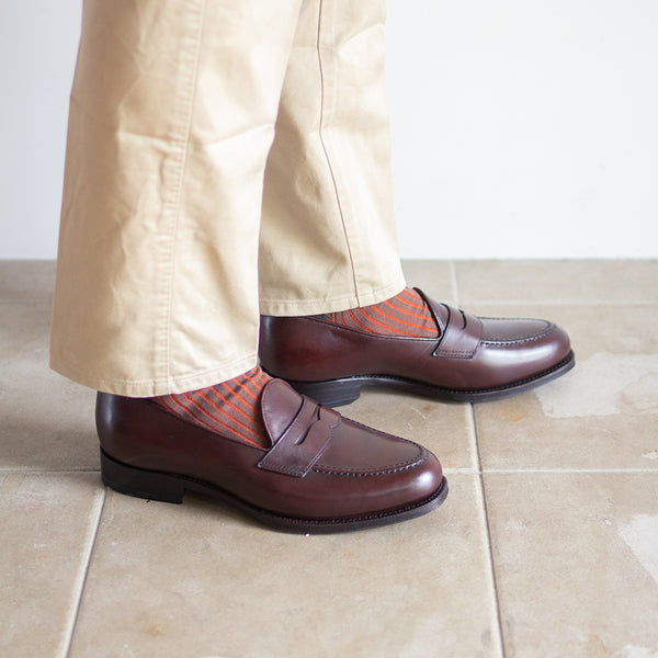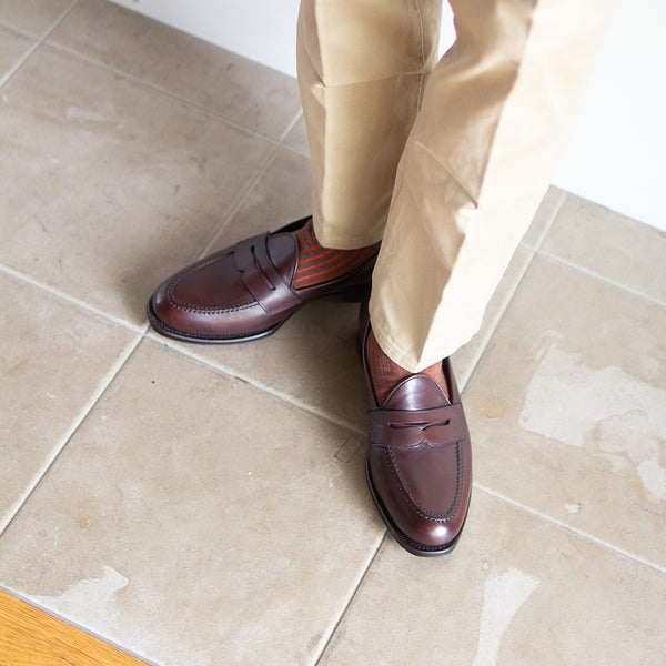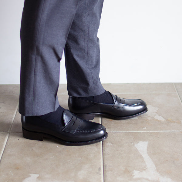 フラットストラップのすっきりとしたデザイン。ペニーローファーの魅力といえば、何と言っても「気軽に履ける革靴」という点でしょう。アイビールックやプレッピーなスタイルに欠かせない、どこか知的で少し着崩したような適度な脱力感と、脱ぎ履きのしやすい、使い勝手の良い革靴である事は最大の魅力といっても過言ではありません。