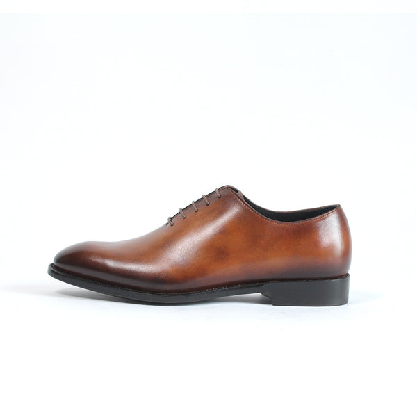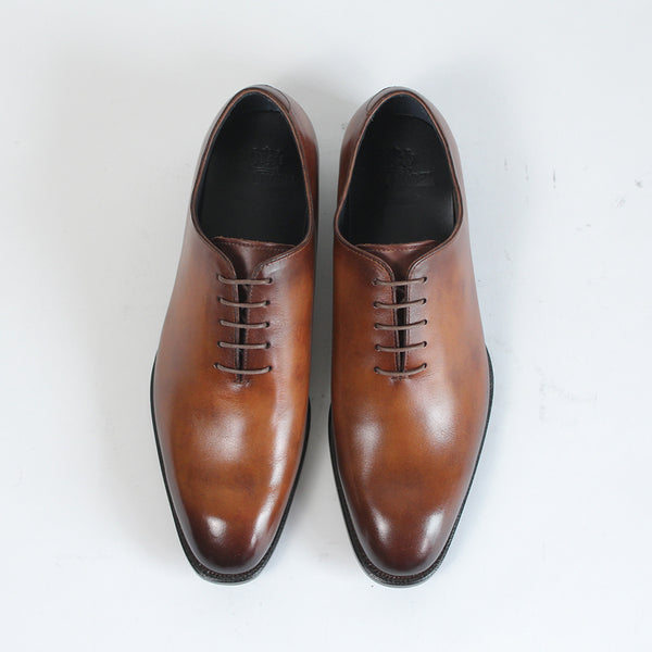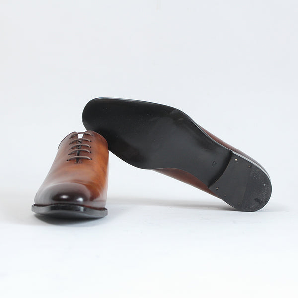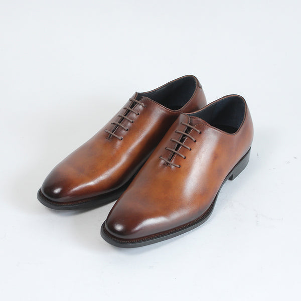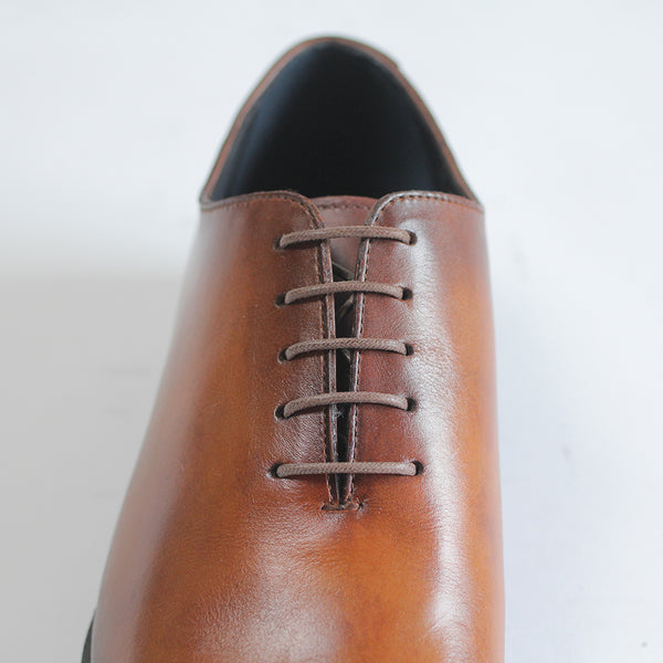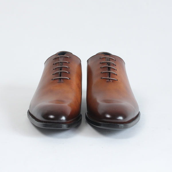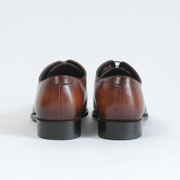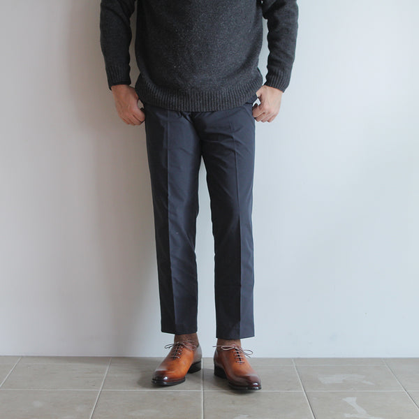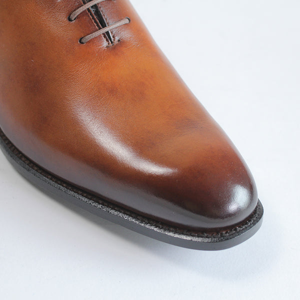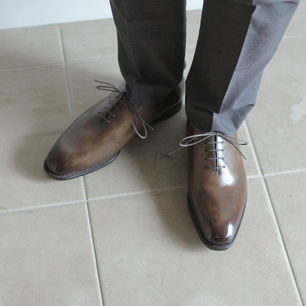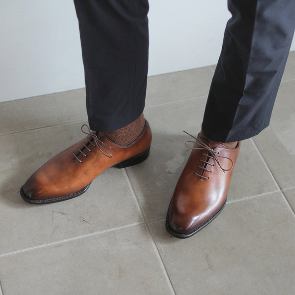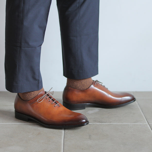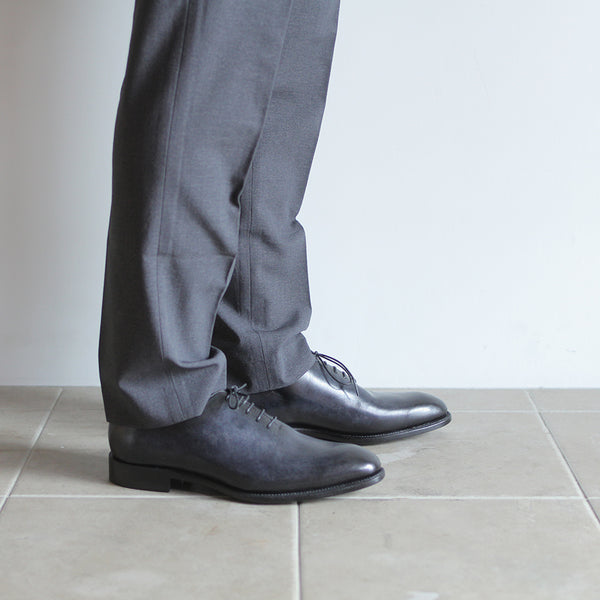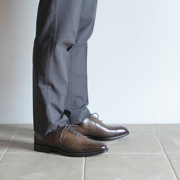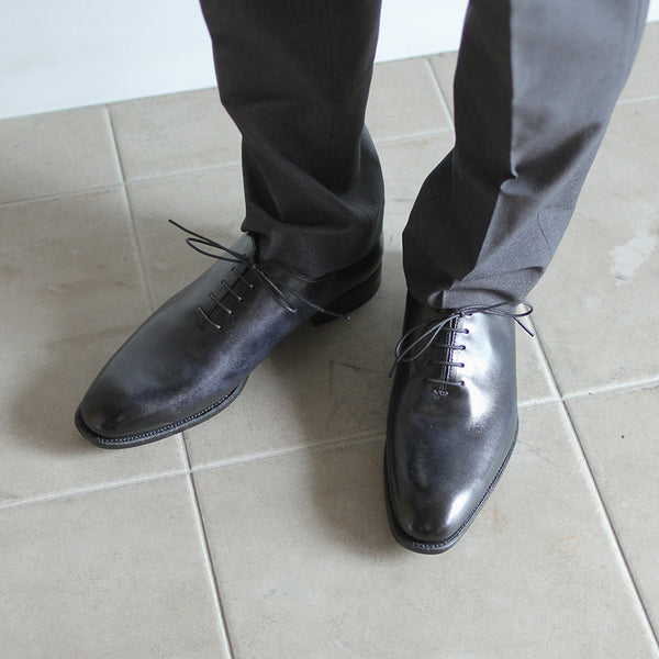 ハイセンスでミニマルな印象が全面に出てくる、シンプルの極み。ワンピースとも言われ、ほとんど継ぎ目のない1枚革で出来ているため、製作には非常に高い技術を要します。足と靴との一体感をこれほど味わえるデザインはないでしょう。まるで1枚のキャンバスに表現された絵画の様に色が映えます。靴職人と千手染(せんじゅぞめ)職人、全ての技が光る至高の逸品。