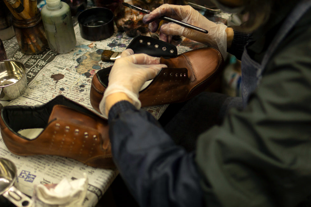 革靴の仕上げにはさまざまな方法がありますが、その中でも特に独特の表情を生み出すのがモンモデル独自の染色技法「千手染」です。千手染は、職人が染料を使って革の色を一足ずつ染め上げる技法で、機械による均一な染色とは異なり、深みのある色合いや自然な濃淡を表現できるのが特徴です。