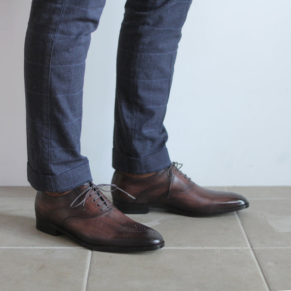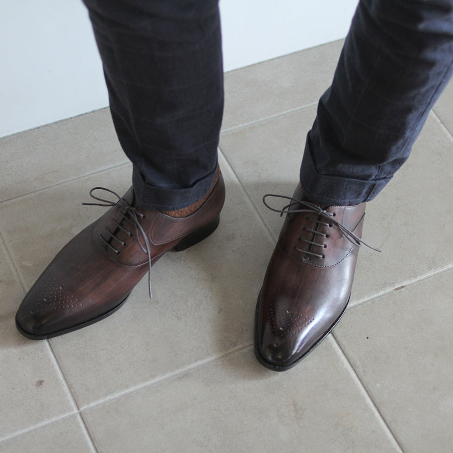一足ずつ丁寧に染め上げられた革靴には、同じものが二つとして存在しません。職人の技術と時間が生み出す色彩は、履く人の個性を静かに引き立て、唯一無二の一足として足元を彩ります。手染めの革靴は、単なる道具ではなく、履く人とともに育っていく特別な存在なのです。